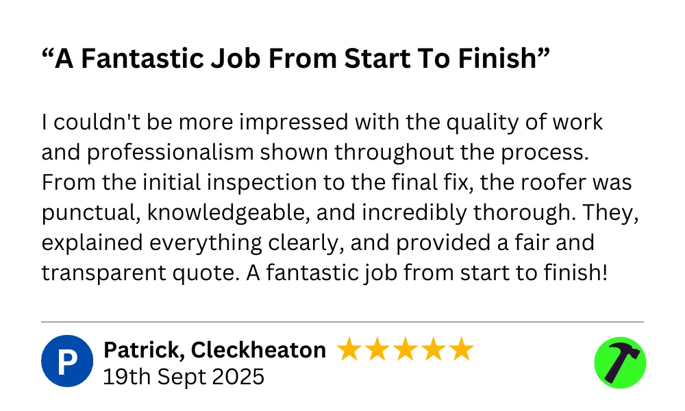 "Hi I'm Patrick and I've been roofing in Huddersfield for over 7 years. I started this business with one goal - to give homeowners a straight, honest service without the hard sell or hidden costs.